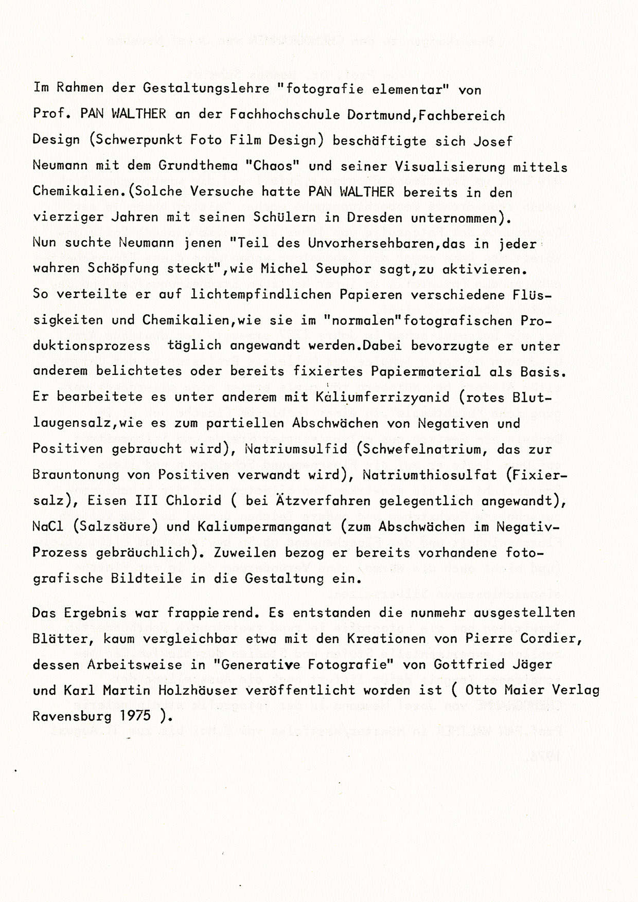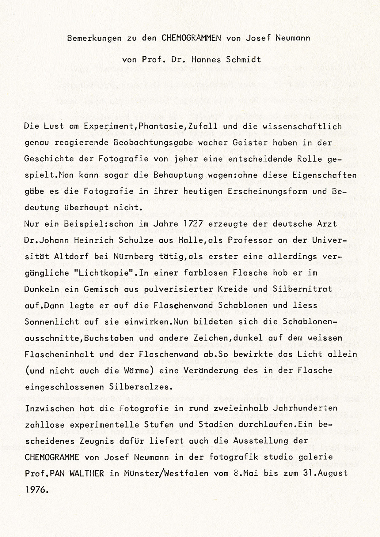 Remarks on the Chemograms by Prof. Dr. Hannes Schmidt, Bonn-Bad Godesberg on the occation of the opening of the Exhibition CHEMOGRAMME in the "fotografik-studio-galerie
